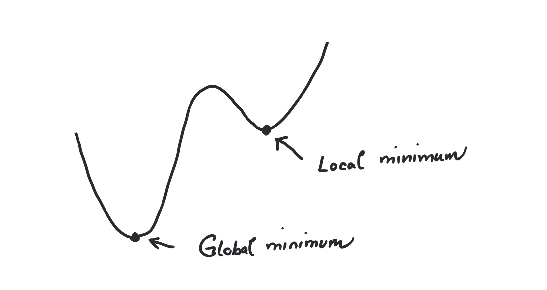 Give an example of a local minimum that is not a global minimum for a precisely specified function.