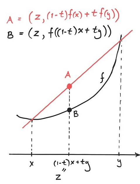 f((1 - t) u + t v) < (1-t) f(u) + t f(v)