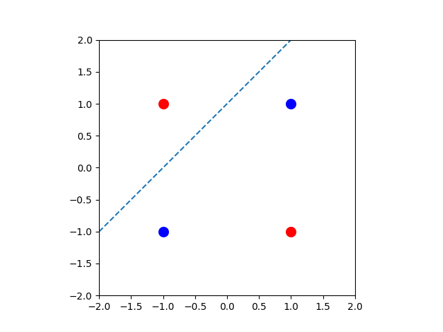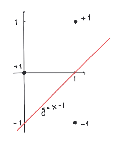Show that it is imposible to find a line separating the red and blue points above. The red points are